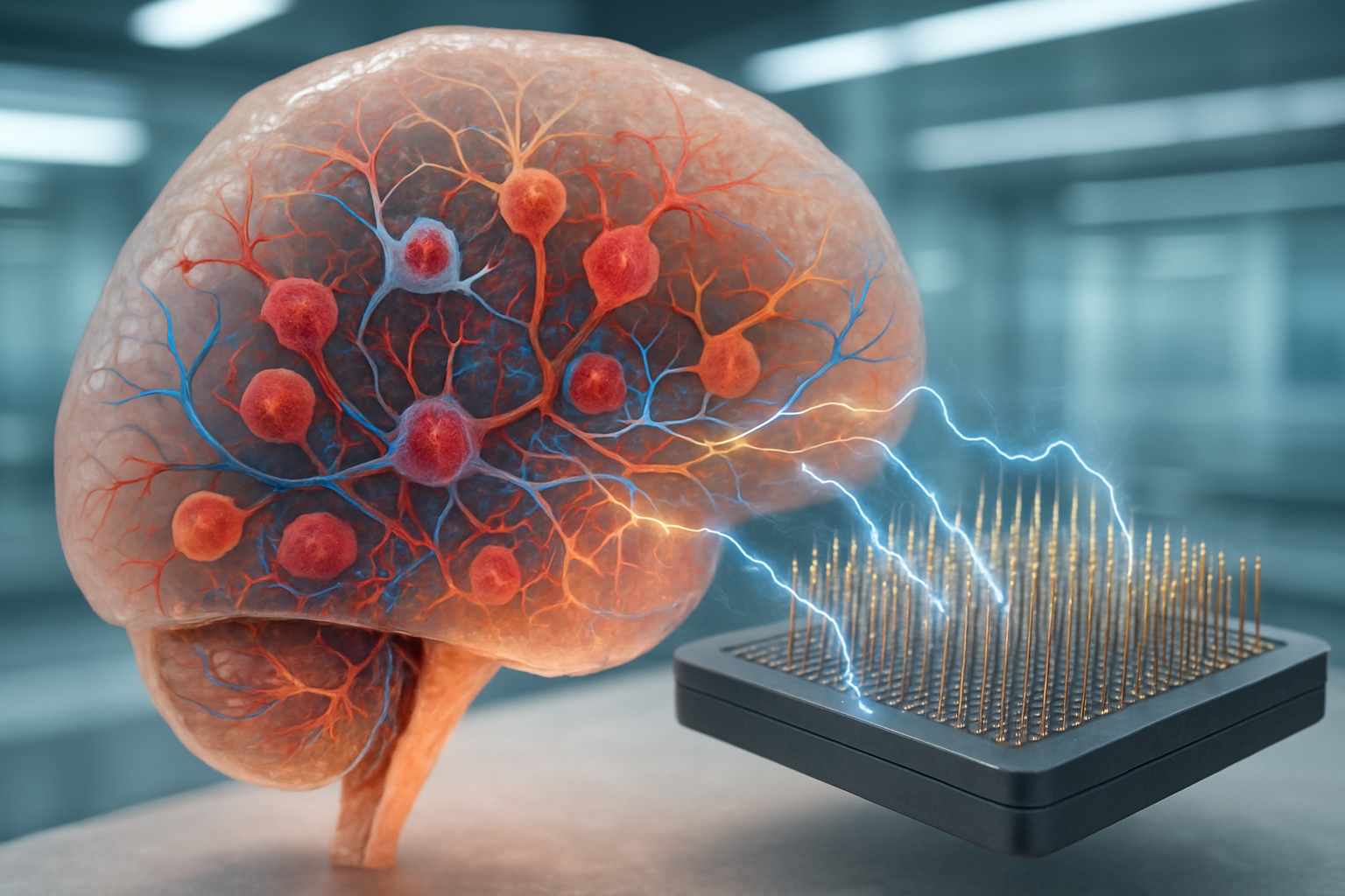 The feasibility of OI rests on two parallel technological achievements. The first is the maturation of human brain organoid technology. Advanced protocols now enable the generation of organoids containing a rich diversity of neuronal and glial cell types, including dopaminergic, GABAergic, glutamatergic, and serotonergic neurons, which are essential for complex network interactions (Smits et al., 2020). These neurons are not just a random assortment; they self-organize into structures that exhibit spontaneous, coordinated electrical activity, complex oscillatory dynamics, and functional connectivity reminiscent of developing neural circuits (Sharf et al., 2022).